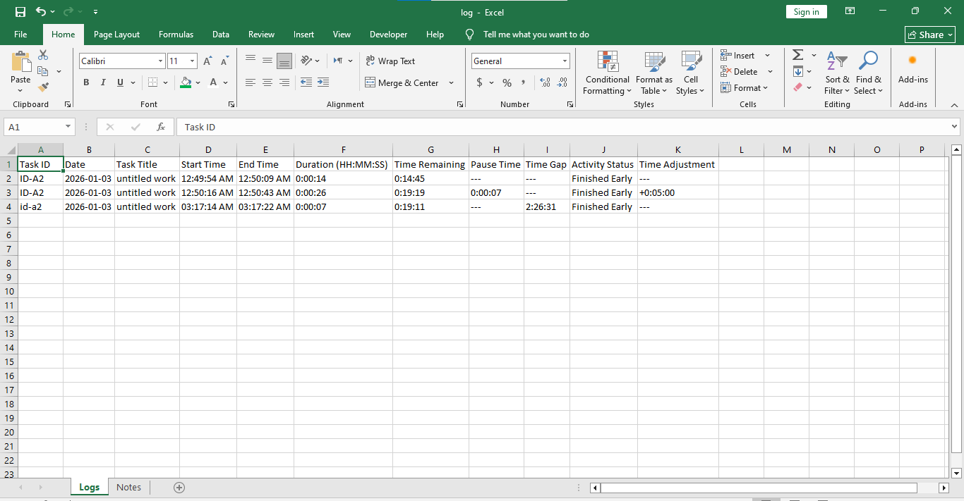 • Automated Excel Logging: Every session is meticulously recorded with start/endtimes, durations, and exact pause times.